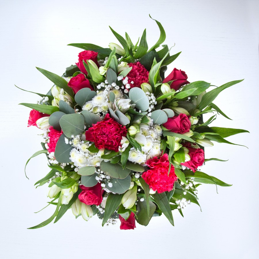 Embrace the timeless elegance of our Charming White Florals Bouquet. This stunning arrangement features sweet white chrysanthemums and gypsophila, beautifully paired with luxurious red roses and cheerful carnations, all accented with white alstroemeria and aspidistra leaves.